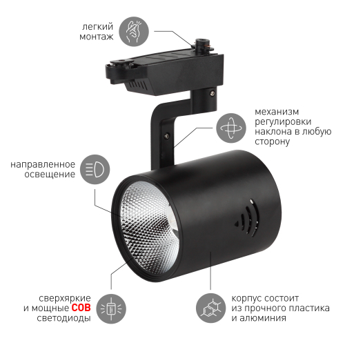 Трековый светильник TR1-30 BK - стильный элемент для создания акцентного освещения. Он имеет поворотную часть, благодаря чему можно менять направление светового потока в зависимости от целей. Цветовая температура имеет показатель 4000 К. Продолжительность службы светильника составляет 30000 часов, коэффициент пульсации светового потока - менее 5%. Трековый светильник от компании Эра наилучшим образом подойдет для создания зонированного пространства. Направленный свет позволит выделить целый стеллаж с продукцией или конкретный товар. Кроме того, такой свет создает в любом помещении особую атмосферу. Трековые светильники легко монтируются, наилучшим образом воплощают дизайнерские идеи, позволяют при необходимости полностью менять восприятие помещения. Трековые светильники компании Эра - выдающийся акцент в любом пространстве.