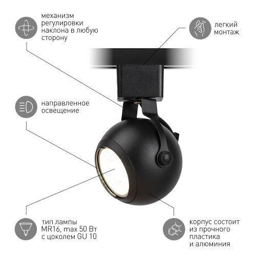 Однофазный трековый светильник под лампу с цоколем GU10. Светильник выполнен из металла, корпус имеет форму шара, установленного на карданный держатель. Плавные формы и многообразие цветов исполнения делают светильник TR35 идеальным кандидатом на роль акцентного света в вашем проекте.