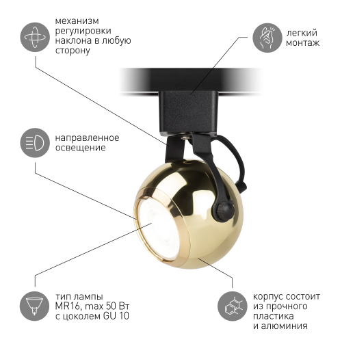 Однофазный трековый светильник под лампу с цоколем GU10. Светильник выполнен из металла, корпус имеет форму шара, установленного на карданный держатель. Плавные формы и многообразие цветов исполнения делают светильник TR35 идеальным кандидатом на роль акцентного света в вашем проекте.