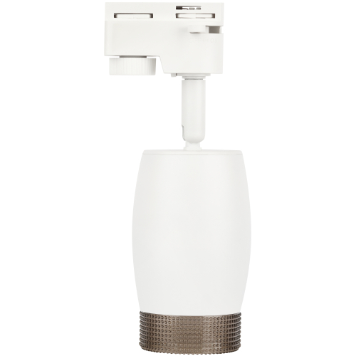 Однофазный трековый светильник под лампу с цоколем GU10. Светильник выполнен из алюминия и пластика. На передней части плафона находится пластиковое кольцо, стилизированное под хрусталь. Во включенном виде данное кольцо наполняется светом и создает превосходный визуальный эффект, а также оно выполняет функцию ограничителя угла рассеивания светового потока, снижая эффект ослепления светом.