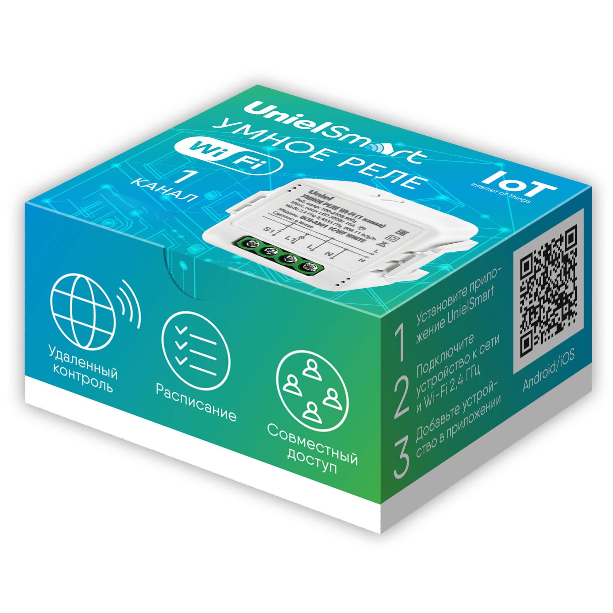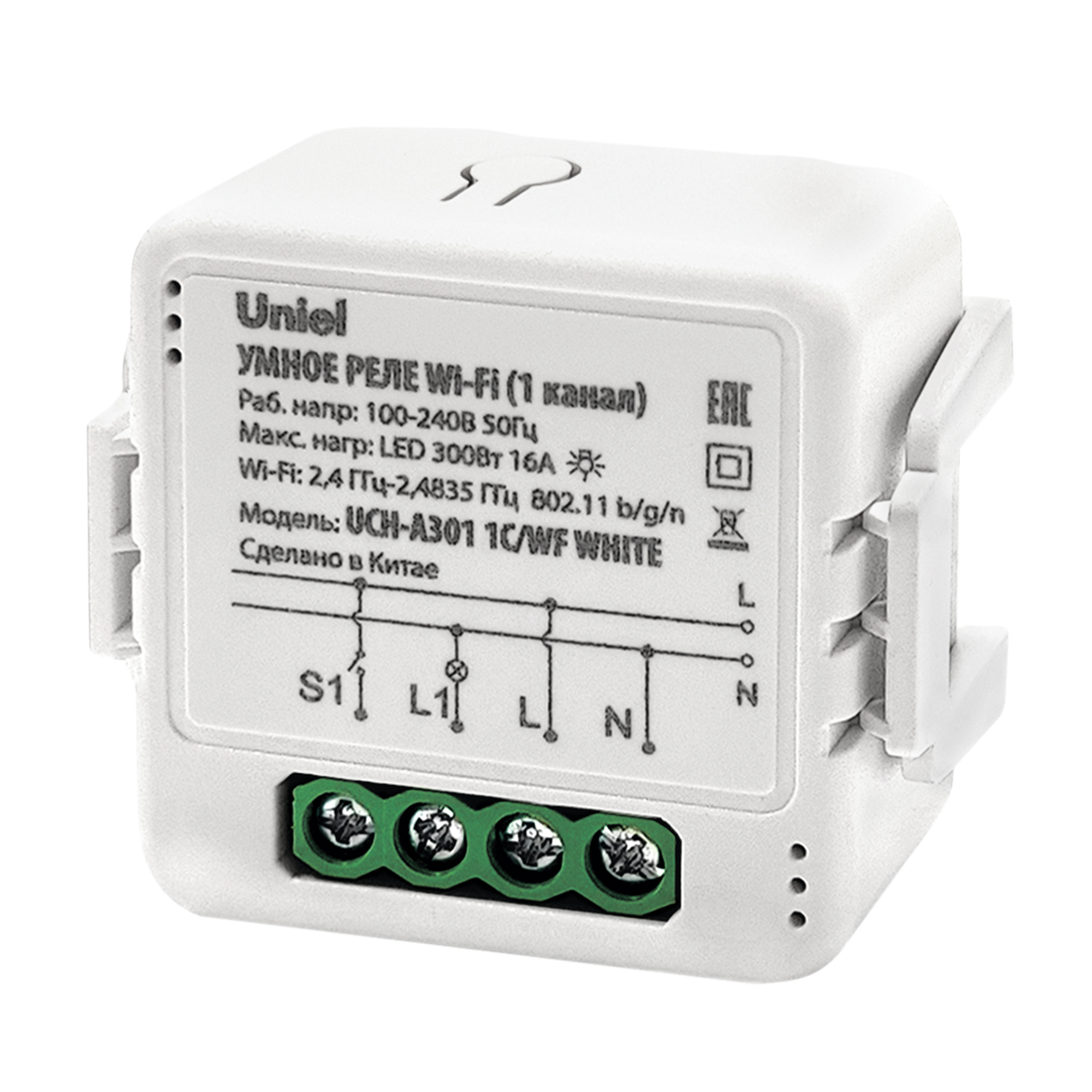 Умное одноканальное реле UCH-A301 1C-WF WHITE со встроенным модулем Wi-Fi предназначено для дистанционного управления включением/выключением освещения через сеть Интернет посредством мобильного приложения UNIEL Smart.