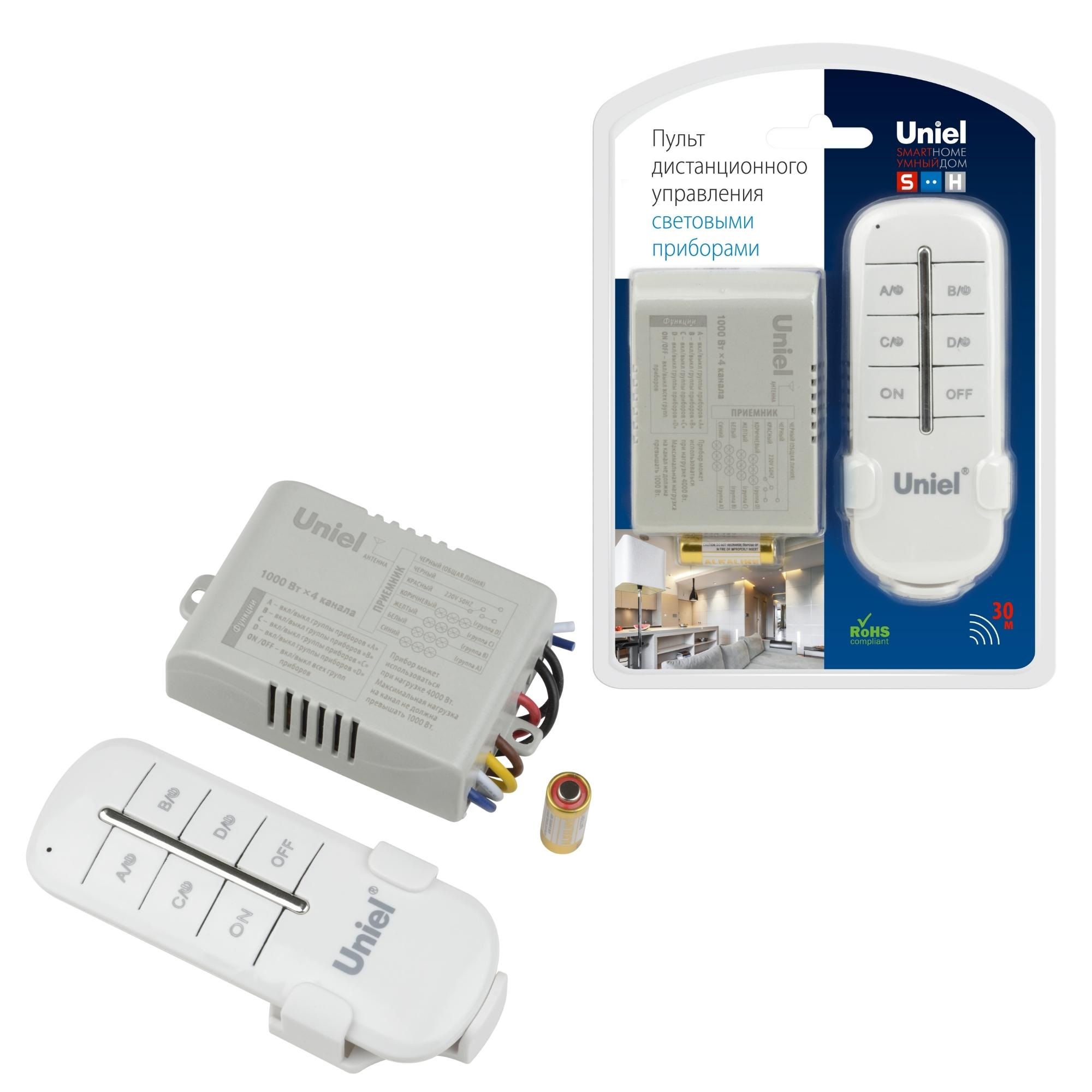 Пульт управления светом UCH-P005-G4-1000W-30M предназначен для дистанционного управления световыми приборами по системе умный дом. Радиус действия - 30 м. Количество подключаемых приборов (групп) - 4. Пульт управления изготовлен из пластика, цвет корпуса - белый. В комплект входит: приемник, пульт и элемент питания 23А/12V. Максимальная нагрузка на канал - 1000 Вт, максимальная суммарная нагрузка - 4000 Вт. Степень пылевлагозащиты - IP20, диапазон рабочих температур - от -10 до +50 С˚.Габариты устройства - ШхВ 50х75 мм. Вес изделия - 180 г. Гарантия от производителя - 1 год.