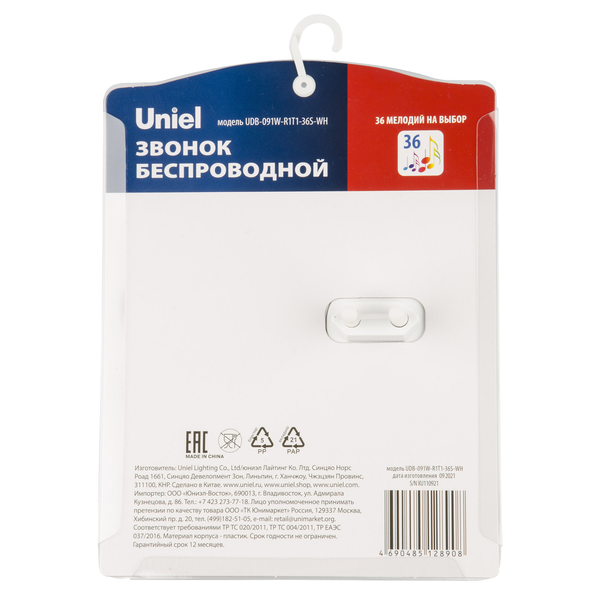 Беспроводной электронный звонок UDB-091W-R1T1-36S-WH предназначен для установки на входные двери, ворота, калитки. Комплект состоит из 2 элементов: кнопки и динамика. В устройстве 36 мелодий. Радиус действия - 100 м. В динамике установлена встроенная световая индикация.Электронный звонок - отличное и мобильное решение для дома и дачи. Прибор изготовлен из пластика белого цвета. Степень пылевлагозащиты кнопки - IP53, степень защиты динамика звонка IP20. Динамик устройства оснащен стандарной розеткой для подключения к сети. Тип питания - 220 В. Элемент питания для кнопки звонка 23А/12V входит в комплект. Требуется подключение к электросети. Простой накладной монтаж. Размер упаковки - ДхШхВ 210х160х80 мм. Общий вес комплекта 222 г. Гарантия - 1 год. Срок службы звонка - 5 лет.
