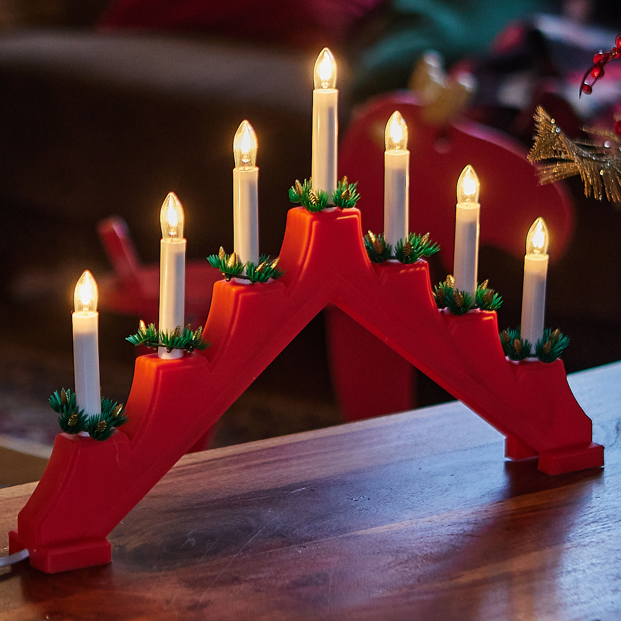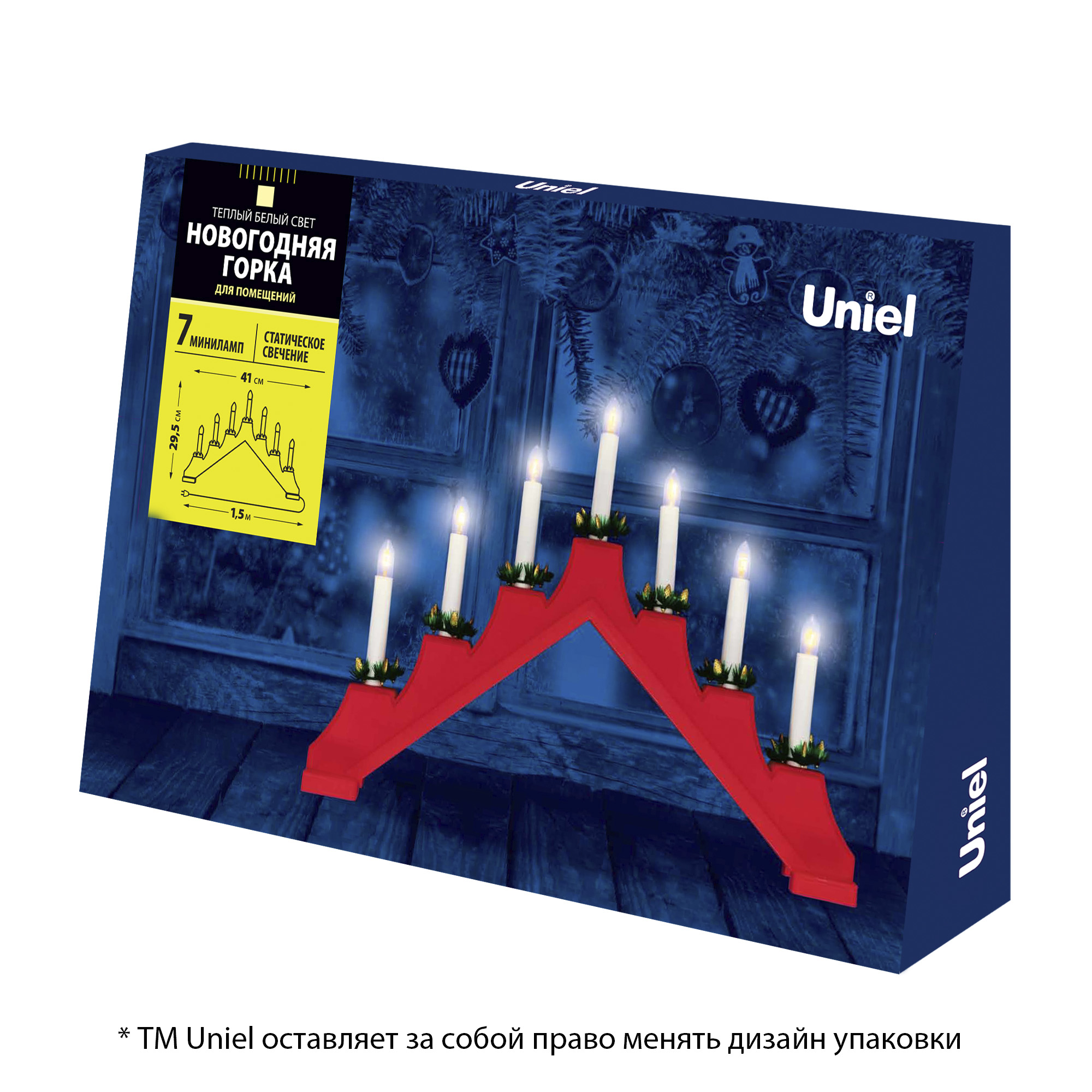 Фигура Новогодняя горка UDL-L7101-007/SWA/WW RED BRIDGE предназначена для декоративной подсветки и новогоднего декора в помещении. В комплектацию входит сетевой кабель длиной 1,5 м. Свет - теплый белый. Тип свечения - статичный. Фигура изготовлена из пластика, цвет корпуса - красный. Общее количество миниламп накаливания - 7 шт. Минилампы выполнены в форме свечей. Мощность - 21 Вт. Степень пылевлагозащиты - IP20, диапазон рабочих температур от -5 до +35 °С. Требуется подключение к сети. Новогодняя горка - простой и оригинальный способ создать праздничную атмосферу дома, на даче, в офисе, в кафе и торговом центре. Поставляется в картонной упаковке. Габариты горки - ДхШхВ 410х50х300 мм. Вес изделия - 326 г. Гарантия от производителя - 1 год. Срок службы - 30 000 часов.