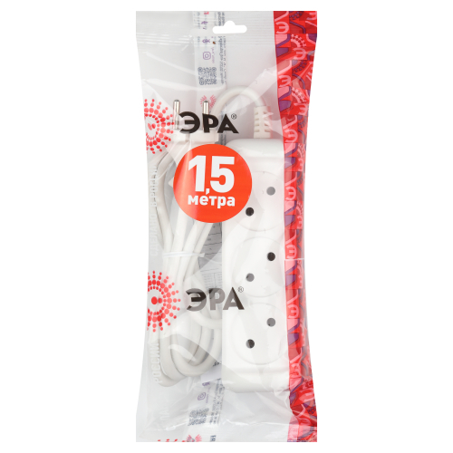 Удлинитель электрический Эра U-3-1,5m без заземления, ПВС, 2x1мм2, 3 розетки, 1,5м. Рассчитан на максимальную мощность 10А/2200 Вт. Удлинитель Эра станет Вашим надежным помощником, если Ваши любимые электроприборы находятся далеко от розеток. Провод в удлинителях Эра сделан из 100% меди, что делает его абсолютно пожаробезопасным. Корпус выполнен из ударопрочного и негорючего пластика (полипропилен). В моделях с заземлением у вилки есть кольцо для удобного извлечения из розетки. Модель удлинителя на 10А позволяет подключить мощные бытовые приборы общей нагрузкой до 2200Вт. Не бойтесь включить чайник, обогреватель, микроволновку или другие электроприборы. Толстый провод удлинителя Эра гарантирует полную безопасность. Дизайн удлинителя разработан в России командой Эра Style.