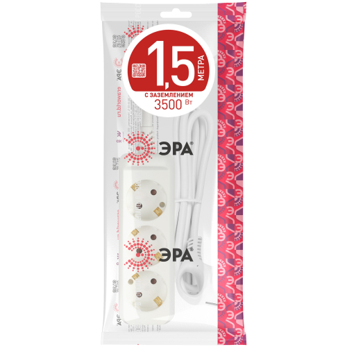 Удлинитель электрический Эра U-3e-1,5m с заземлением, ПВС, 3x1мм2, 3 розетки, 1,5м. Рассчитан на максимальную мощность 16А/3500 Вт. Удлинитель Эра станет Вашим надежным помощником, если Ваши любимые электроприборы находятся далеко от розеток. Провод в удлинителях Эра сделан из 100% меди, что делает его абсолютно пожаробезопасным. Корпус выполнен из ударопрочного и негорючего пластика (полипропилен). В моделях с заземлением у вилки есть кольцо для удобного извлечения из розетки. Модель удлинителя на 16А позволяет подключить мощные бытовые приборы общей нагрузкой до 3500Вт. Не бойтесь включить чайник, обогреватель, микроволновку или другие электроприборы. Толстый провод удлинителя Эра гарантирует полную безопасность. Дизайн удлинителя разработан в России командой Эра Style.