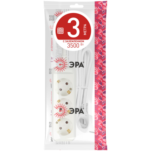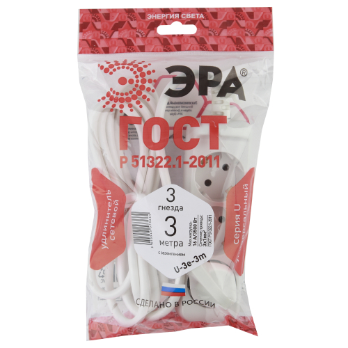 Удлинитель электрический Эра U-3e-3m с заземлением, ПВС, 3x1мм2, 3 розетки, 3м. Рассчитан на максимальную мощность 16А/3500 Вт. Удлинитель Эра станет Вашим надежным помощником, если Ваши любимые электроприборы находятся далеко от розеток. Провод в удлинителях Эра сделан из 100% меди, что делает его абсолютно пожаробезопасным. Корпус выполнен из ударопрочного и негорючего пластика (полипропилен). В моделях с заземлением у вилки есть кольцо для удобного извлечения из розетки. Модель удлинителя на 16А позволяет подключить мощные бытовые приборы общей нагрузкой до 3500Вт. Не бойтесь включить чайник, обогреватель, микроволновку или другие электроприборы. Толстый провод удлинителя Эра гарантирует полную безопасность. Дизайн удлинителя разработан в России командой Эра Style.