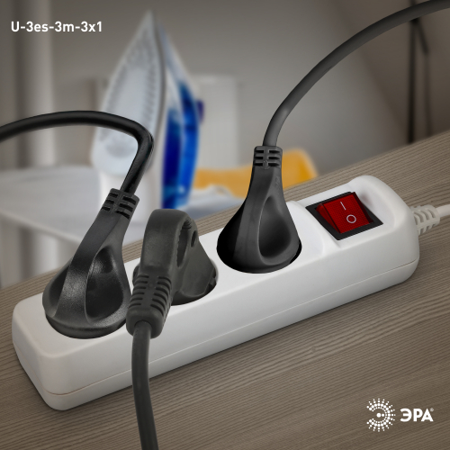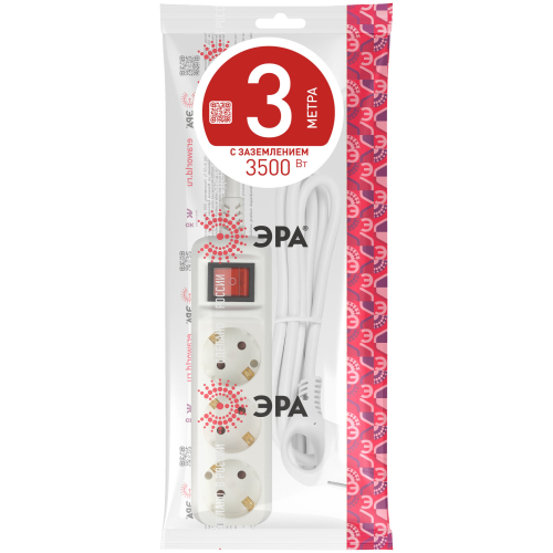 Удлинитель электрический Эра U-3es-3m-3x1 с заземлением, с выключателем, ПВС, 3x1мм2, 3 розетки, 3 м. Рассчитан на максимальную мощность 16А/3500 Вт. Удлинитель Эра станет Вашим надежным помощником, если Ваши любимые электроприборы находятся далеко от розеток. Провод в удлинителях Эра сделан из 100% меди, что делает его абсолютно пожаробезопасным. Корпус выполнен из ударопрочного и негорючего пластика (полипропилен). В моделях с заземлением у вилки есть кольцо для удобного извлечения из розетки. Модель удлинителя на 16А позволяет подключить мощные бытовые приборы общей нагрузкой до 3500Вт. Не бойтесь включить чайник, обогреватель, микроволновку или другие электроприборы. Толстый провод удлинителя Эра гарантирует полную безопасность. Дизайн удлинителя разработан в России командой Эра Style.