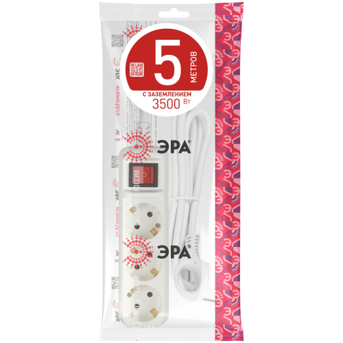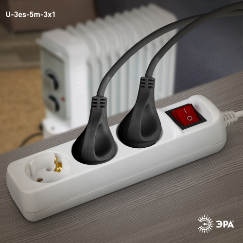 Удлинитель электрический Эра U-3es-5m-3x1 с заземлением, с выключателем, ПВС, 3x1мм2, 3 розетки, 5 м. Рассчитан на максимальную мощность 16А/3500 Вт. Удлинитель Эра станет Вашим надежным помощником, если Ваши любимые электроприборы находятся далеко от розеток. Провод в удлинителях Эра сделан из 100% меди, что делает его абсолютно пожаробезопасным. Корпус выполнен из ударопрочного и негорючего пластика (полипропилен). В моделях с заземлением у вилки есть кольцо для удобного извлечения из розетки. Модель удлинителя на 16А позволяет подключить мощные бытовые приборы общей нагрузкой до 3500Вт. Не бойтесь включить чайник, обогреватель, микроволновку или другие электроприборы. Толстый провод удлинителя Эра гарантирует полную безопасность. Дизайн удлинителя разработан в России командой Эра Style.