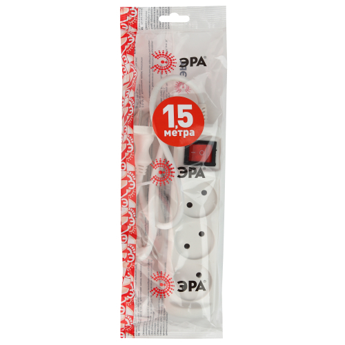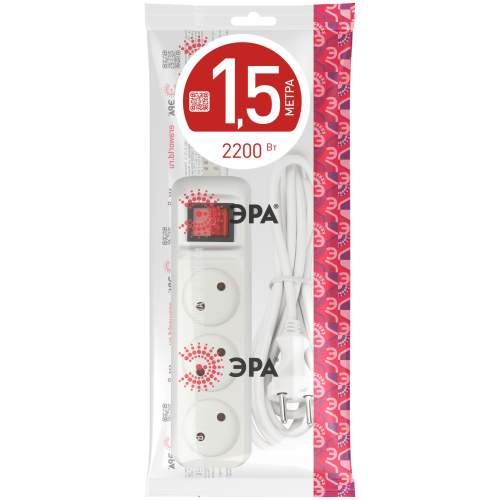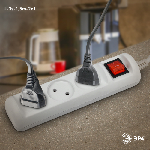 Удлинитель электрический Эра U-3s-1,5m-2x1 без заземления, с выключателем, ПВС, 2x1мм2, 3 розетки, 1,5м. Рассчитан на максимальную мощность 10А/2200 Вт. Удлинитель Эра станет Вашим надежным помощником, если Ваши любимые электроприборы находятся далеко от розеток. Провод в удлинителях Эра сделан из 100% меди, что делает его абсолютно пожаробезопасным. Корпус выполнен из ударопрочного и негорючего пластика (полипропилен). Модель удлинителя на 10А позволяет подключить бытовые приборы общей нагрузкой до 2200Вт. Дизайн удлинителя разработан в России командой Эра Style.