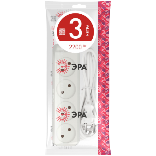 Удлинитель электрический Эра U-4-3m без заземления, ПВС, 2x1мм2, 4 розетки, 3м. Рассчитан на максимальную мощность 10А/2200 Вт. Удлинитель Эра станет Вашим надежным помощником, если Ваши любимые электроприборы находятся далеко от розеток. Провод в удлинителях Эра сделан из 100% меди, что делает его абсолютно пожаробезопасным. Корпус выполнен из ударопрочного и негорючего пластика (полипропилен). В моделях с заземлением у вилки есть кольцо для удобного извлечения из розетки. Модель удлинителя на 10А позволяет подключить мощные бытовые приборы общей нагрузкой до 2200Вт. Не бойтесь включить чайник, обогреватель, микроволновку или другие электроприборы. Толстый провод удлинителя Эра гарантирует полную безопасность. Дизайн удлинителя разработан в России командой Эра Style.