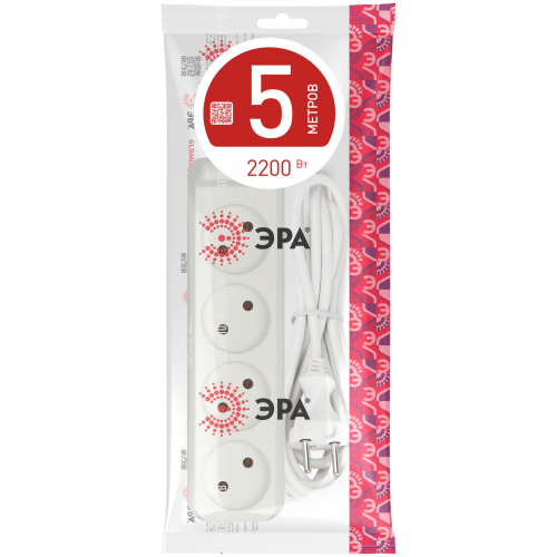 Удлинитель электрический Эра U-4-5m без заземления, ПВС, 2x1мм2, 4 розетки, 5м. Рассчитан на максимальную мощность 10А/2200 Вт. Удлинитель Эра станет Вашим надежным помощником, если Ваши любимые электроприборы находятся далеко от розеток. Провод в удлинителях Эра сделан из 100% меди, что делает его абсолютно пожаробезопасным. Корпус выполнен из ударопрочного и негорючего пластика (полипропилен). В моделях с заземлением у вилки есть кольцо для удобного извлечения из розетки. Модель удлинителя на 10А позволяет подключить мощные бытовые приборы общей нагрузкой до 2200Вт. Не бойтесь включить чайник, обогреватель, микроволновку или другие электроприборы. Толстый провод удлинителя Эра гарантирует полную безопасность. Дизайн удлинителя разработан в России командой Эра Style.
