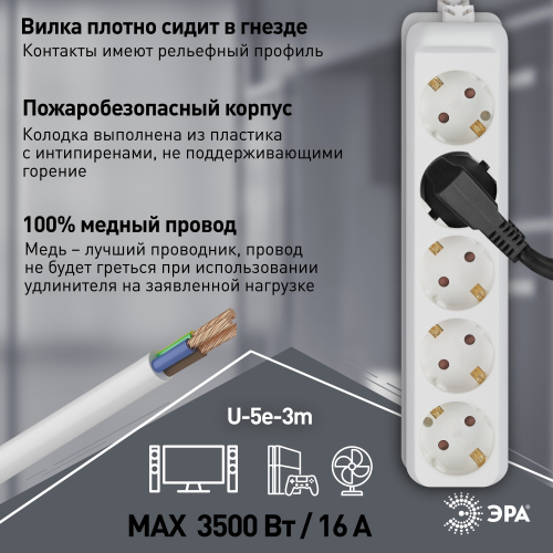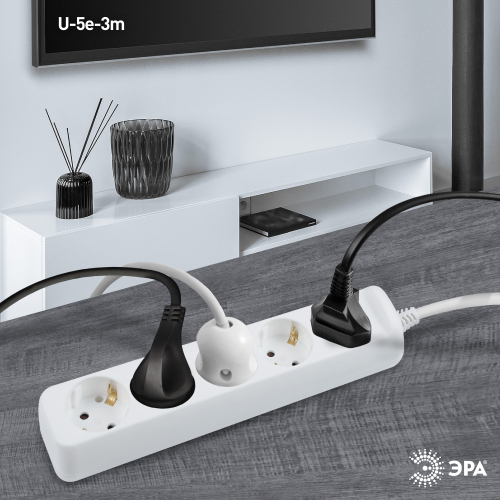 Удлинитель электрический Эра U-5e-3m-3x1,5 с заземлением, 5 розеток, 3м ПВС 3x1,5мм2. Для мощных приборов. Рассчитан на максимальную мощность 16А/3500. Удлинитель Эра станет Вашим надежным помощником, если Ваши любимые электроприборы находятся далеко от розеток.