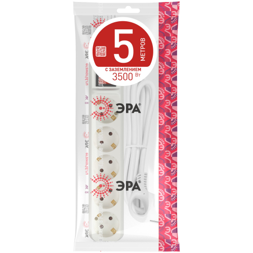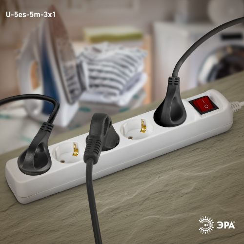 Удлинитель электрический Эра U-5es-5m-3x1 с заземлением, с выключателем, ПВС, 3x1мм2, 5 розетки, 5 м. Рассчитан на максимальную мощность 16А/3500 Вт. Удлинитель Эра станет Вашим надежным помощником, если Ваши любимые электроприборы находятся далеко от розеток. Провод в удлинителях Эра сделан из 100% меди, что делает его абсолютно пожаробезопасным. Корпус выполнен из ударопрочного и негорючего пластика (полипропилен). В моделях с заземлением у вилки есть кольцо для удобного извлечения из розетки. Модель удлинителя на 16А позволяет подключить мощные бытовые приборы общей нагрузкой до 3500Вт. Не бойтесь включить чайник, обогреватель, микроволновку или другие электроприборы. Толстый провод удлинителя Эра гарантирует полную безопасность. Дизайн удлинителя разработан в России командой Эра Style.