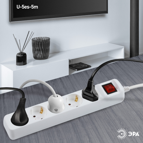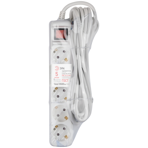 Удлинитель электрический Эра U-5es-5m-3x1,5 с заземлением, с выключателем, 5 розеток, 5м ПВС 3x1,5мм2. Для мощных приборов. Рассчитан на максимальную мощность 16А/3500. Удлинитель Эра станет Вашим надежным помощником, если Ваши любимые электроприборы находятся далеко от розеток.