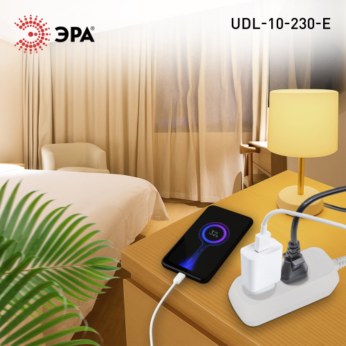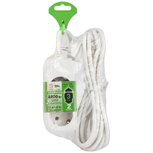 Удлинитель электрический Эра GREENLINE UDL-10-230-E с заземлением, 2 розетки, провод 3м ПВС 3x0,75мм2. Рассчитан на максимальную мощность 10А/2200 Вт. Удлинитель станет Вашим надежным помощником, если любимые электроприборы находятся далеко от розеток. Корпус выполнен из ударопрочного и негорючего пластика (полипропилен). Вилка обеспечена кольцом для удобного извлечения ее из розетки. Модель удлинителя на 10А позволяет подключить бытовые приборы общей нагрузкой до 2200Вт.