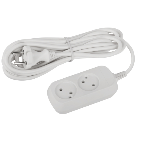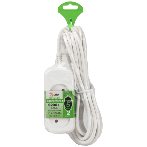 Удлинитель электрический Эра GREENLINE UDL-10-250 без заземления, на 2 розетки, провод 5м ПВС 2x0,75мм2. Рассчитан на максимальную мощность 10А/2200 Вт. Удлинитель станет Вашим надежным помощником, если любимые электроприборы находятся далеко от розеток. Корпус выполнен из ударопрочного и негорючего пластика (полипропилен). Модель удлинителя на 10А позволяет подключать бытовые приборы общей нагрузкой до 2200Вт.