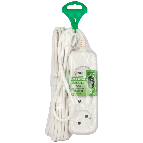 Удлинитель электрический Эра GREENLINE UDL-10-370 без заземления, на 3 розетки, провод 7м ПВС 2x1мм2. Рассчитан на максимальную мощность 10А/2200 Вт. Удлинитель станет Вашим надежным помощником, если любимые электроприборы находятся далеко от розеток. Корпус выполнен из ударопрочного и негорючего пластика (полипропилен). Модель удлинителя на 10А позволяет подключать бытовые приборы общей нагрузкой до 2200Вт.