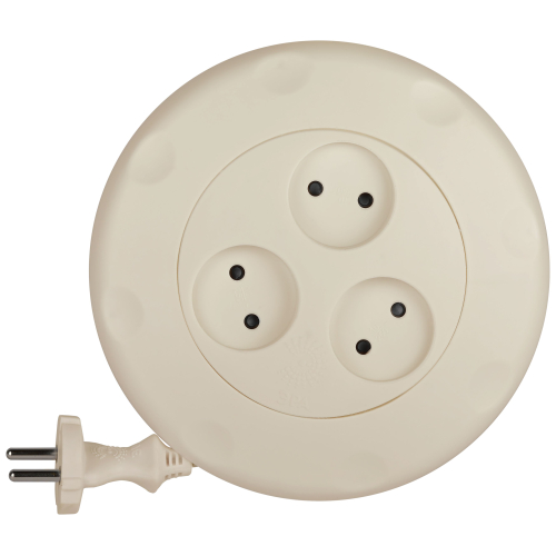 Удлинитель ЭРА Calypso. Катушка - удобный ручной механизм сматывания провода. Максимальная мощность - 10А/2200В. Материал копуса - полипропилен с антипиренами (негорючий). Контактные группы - латунь.