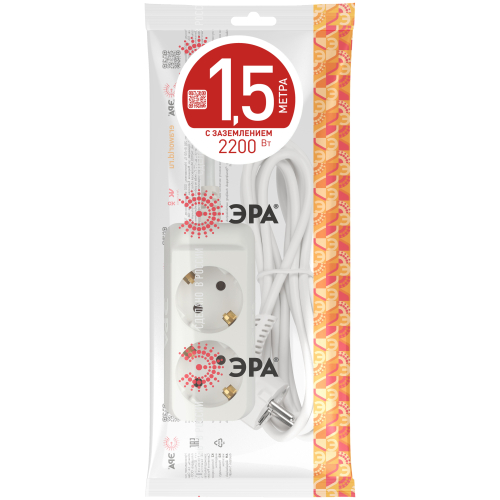 Компактный бытовой удлинитель ЭРА UX-2e-1,5m с заземлением и удобной вилкой с кольцом. Длина шнура - 1,5 метра, 2 розетки. Позволяет подключать электроприборы с максимальной нагрузкой 10 А/ 2200 Вт. Этот надёжный и безопасный удлинитель изготовлен из негорючих материалов и имеет трёхжильный медный провод ПВС.