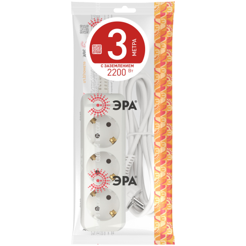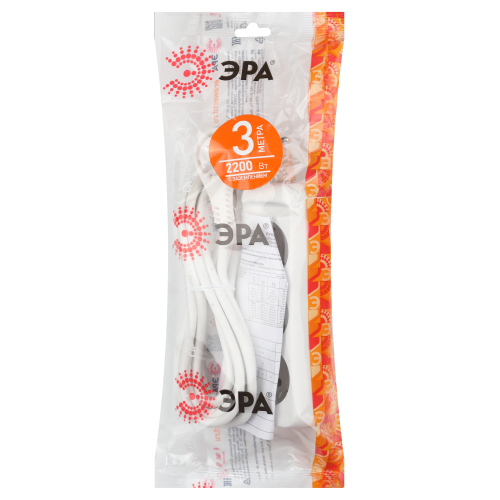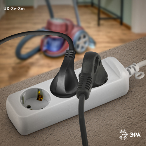 Удлинитель электрический Эра UX-3e-3m с заземлением, ПВС, 3x0,75мм2, 3 розетки, 3 м. Рассчитан на максимальную мощность 10А/2200 Вт. Удлинитель Эра станет Вашим надежным помощником, если Ваши любимые электроприборы находятся далеко от розеток. Провод в удлинителях Эра сделан из 100% меди, что делает его абсолютно пожаробезопасным. Корпус выполнен из ударопрочного и негорючего пластика (полипропилен). Вилка обеспечена кольцом для удобного извлечения ее из розетки. Модель удлинителя на 10А позволяет подключить бытовые приборы общей нагрузкой до 2200Вт. Дизайн удлинителя разработан в России командой Эра Style.