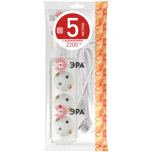 Удлинитель электрический Эра UX-3e-5m с заземлением, ПВС, 3x0,75мм2, 3 розетки, 5 м. Рассчитан на максимальную мощность 10А/2200 Вт. Удлинитель Эра станет Вашим надежным помощником, если Ваши любимые электроприборы находятся далеко от розеток. Провод в удлинителях Эра сделан из 100% меди, что делает его абсолютно пожаробезопасным. Корпус выполнен из ударопрочного и негорючего пластика (полипропилен). Вилка обеспечена кольцом для удобного извлечения ее из розетки. Модель удлинителя на 10А позволяет подключить бытовые приборы общей нагрузкой до 2200Вт. Дизайн удлинителя разработан в России командой Эра Style.