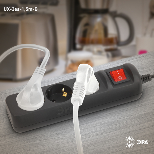 Удлинитель электрический Эра UX-3es-1,5m-B с заземлением, с выключателем, черный, 3 розетки. Провод ПВС, 3x0,75мм2, 1,5 м. Рассчитан на максимальную мощность 10А/2200 Вт. Удлинитель Эра станет Вашим надежным помощником, если Ваши любимые электроприборы находятся далеко от розеток. Провод в удлинителях Эра сделан из 100% меди, что делает его абсолютно пожаробезопасным. Корпус выполнен из ударопрочного и негорючего пластика (полипропилен). Вилка обеспечена кольцом для удобного извлечения ее из розетки. Модель удлинителя на 10А позволяет подключить бытовые приборы общей нагрузкой до 2200Вт. Дизайн удлинителя разработан в России командой Эра Style.