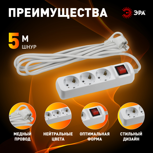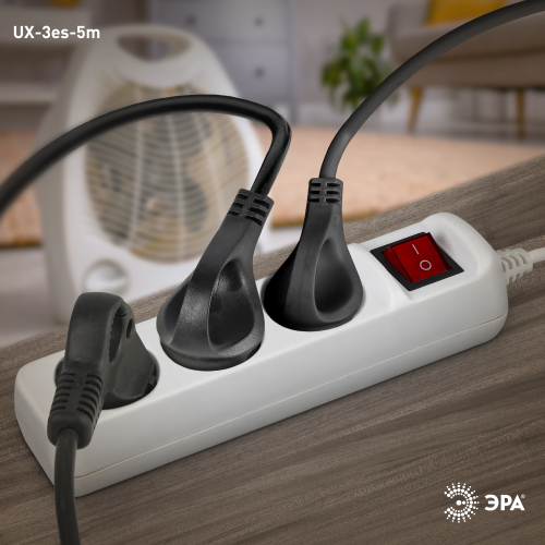 Удлинитель электрический Эра UX-3es-5m с заземлением, с выключателем, ПВС, 3x0,75мм2, 3 розетки, 5 м. Рассчитан на максимальную мощность 10А/2200 Вт. Удлинитель Эра станет Вашим надежным помощником, если Ваши любимые электроприборы находятся далеко от розеток. Провод в удлинителях Эра сделан из 100% меди, что делает его абсолютно пожаробезопасным. Корпус выполнен из ударопрочного и негорючего пластика (полипропилен). Вилка обеспечена кольцом для удобного извлечения ее из розетки. Модель удлинителя на 10А позволяет подключить бытовые приборы общей нагрузкой до 2200Вт. Дизайн удлинителя разработан в России командой Эра Style.