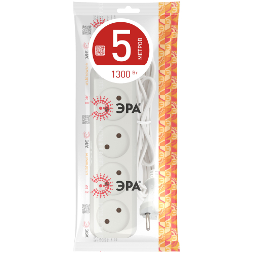 Бытовой удлинитель ЭРА UX-4-5m на 4 розетки, без заземления, с удлинённым проводом ШВВП 5 метров. Рассчитан для подключения простых бытовых приборов стандартной мощности. Максимальная нагрузка - 6 A/ 1300 Вт. Базовый белый цвет, аккуратный дизайн с закруглёнными углами. Для комфорта и безопасности гнёзда слегка "утоплены" в корпус. Изготовлен из надёжного полипропилена со специальными антипиренами, препятствующими горению.