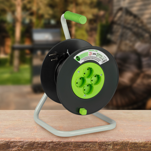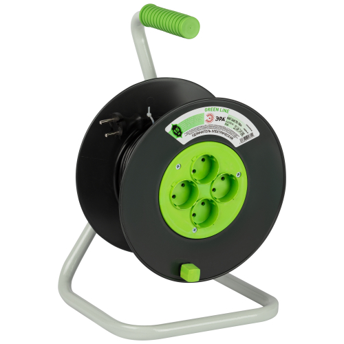Удлинитель силовой ЭРА GREEN LINE на пластиковой катушке KAT-2x0.75-15m, 4 розетки без крышек -IP20 без заземления. Провод ПВС 2х0,75мм2, 15м. Мощность 6А/1300Вт. Используется для работы на строительных площадках или дачных участках. Удобен при работе с приборами, находящимися удаленно от стационарной розетки. Например, газонокосилки, электрические, пилы, триммеры или электродрели. Рама катушки сделана из высокопрочной стали, а пластиковой корпус катушки выполнен с применением негорючих добавок.