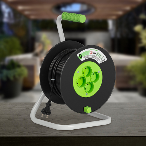 Удлинитель силовой ЭРА GREEN LINE на пластиковой катушке KAT-2x1-40m, 4 розетки без крышек -IP20 без заземления. Провод ПВС 2х1мм2, 40м. Мощность 10А/2200Вт. Используется для работы на строительных площадках или дачных участках. Удобен при работе с приборами, находящимися удаленно от стационарной розетки. Например, газонокосилки, электрические, пилы, триммеры или электродрели. Рама катушки сделана из высокопрочной стали, а пластиковой корпус катушки выполнен с применением негорючих добавок.