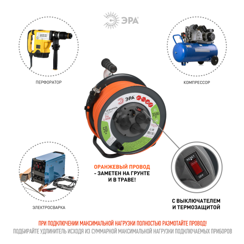 Удлинитель ЭРА RMx-4es-3x2.5-50m-IP44 на металлической катушке, с заземлением, с выключателем, ПВС 3х2,5мм2, 4 гнезда, IP44, мощность 16А / 3500Вт, провод 50м. Используется для работы на строительных площадках или дачных участках. Удобен при работе с приборами находящимися удаленно от стационарной розетки. Например, газонокосилки, электрические, пилы, триммеры или электродрели. Провод в удлинителях Эра сделан из 100% меди, что делает его абсолютно пожаробезопасным. Рама удлинителя сделана из высокопрочной стали.