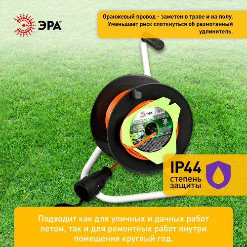 Удлинитель силовой на пластиковой катушке ЭРА RP-1-2x1-30m без заземления, 1 розетка, провод ПВС 2х1м2, 30 м. Мощность 10А/2200Вт. Степень защиты IP44. Используется для работы на строительных площадках или дачных участках. Удобен при работе с приборами, находящимися удаленно от стационарной розетки. Например, газонокосилки, электрические, пилы, триммеры или электродрели. Провод в удлинителях Эра сделан из 100% меди, что делает его абсолютно пожаробезопасным. Рама удлинителя сделана из высокопрочной стали, а пластиковой корпус выполнен с применением негорючих добавок.