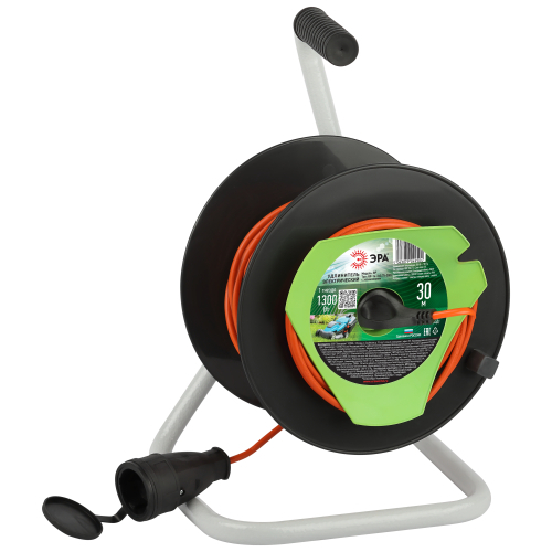 Удлинитель силовой на пластиковой катушке ЭРА RP-1e-3х0.75-30m с заземлением, 1 розетка, провод ПВС 3х0,75м2, 30 м. Мощность 6А/1300Вт. Степень защиты IP44. Используется для работы на строительных площадках или дачных участках. Удобен при работе с приборами, находящимися удаленно от стационарной розетки. Например, газонокосилки, электрические, пилы, триммеры или электродрели. Провод в удлинителях Эра сделан из 100% меди, что делает его абсолютно пожаробезопасным. Рама удлинителя сделана из высокопрочной стали, а пластиковой корпус выполнен с применением негорючих добавок.