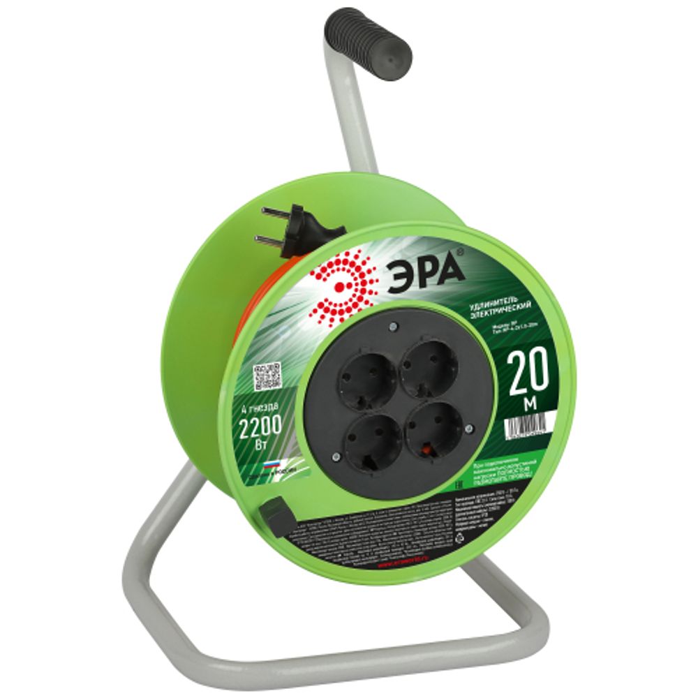 Удлинитель силовой на пластиковой катушке ЭРА RP-4-2x1.0-20m без заземления, 4 розетки, провод ПВС 2х1м2, 20 м. Мощность 10А/2200Вт. Используется для работы на строительных площадках или дачных участках. Удобен при работе с приборами, находящимися удаленно от стационарной розетки. Например, газонокосилки, электрические, пилы, триммеры или электродрели. Провод в удлинителях Эра сделан из 100% меди, что делает его абсолютно пожаробезопасным. Рама удлинителя сделана из высокопрочной стали, а пластиковой корпус выполнен с применением негорючих добавок.