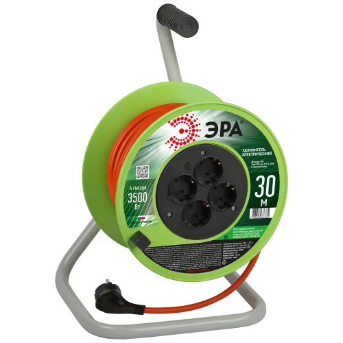 Удлинитель силовой на пластиковой катушке ЭРА RP-4e-3x1.5-30m с заземлением, 4 розетки, провод ПВС 3х1,5м2, 30 м. Мощность 16А/3500Вт. Используется для работы на строительных площадках или дачных участках. Удобен при работе с приборами, находящимися удаленно от стационарной розетки. Например, газонокосилки, электрические, пилы, триммеры или электродрели. Провод в удлинителях Эра сделан из 100% меди, что делает его абсолютно пожаробезопасным. Рама удлинителя сделана из высокопрочной стали, а пластиковой корпус выполнен с применением негорючих добавок.