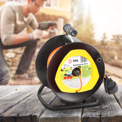 Удлинитель силовой на пластиковой катушке ЭРА RPx-1-2x1-20m без заземления, ПВС 2х1м2, 1 розетка, 20 м. Мощность 10А/2200Вт. Используется для работы на строительных площадках или дачных участках. Удобен при работе с приборами находящимися удаленно от стационарной розетки,. Например, газонокосилки, электрические, пилы, триммеры или электродрели. Провод в удлинителях Эра сделан из 100% меди, что делает его абсолютно пожаробезопасным. Рама удлинителя сделана из высокопрочной стали а пластиковой корпус выполнен с применением негорючих добавок.