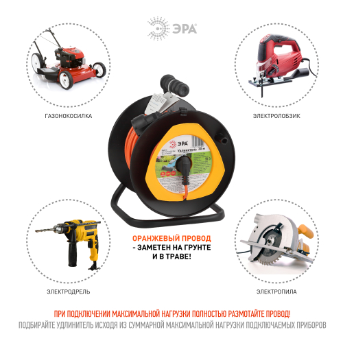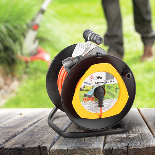 Удлинитель силовой на пластиковой катушке ЭРА RPx-1e-3х0.75-30m с заземлением, ПВС 3х0,75м2, 1 розетка, 30 м. Мощность 6А/1300Вт. Используется для работы на строительных площадках или дачных участках. Удобен при работе с приборами находящимися удаленно от стационарной розетки. Например, газонокосилки, электрические, пилы, триммеры или электродрели. Провод в удлинителях Эра сделан из 100% меди, что делает его абсолютно пожаробезопасным. Рама удлинителя сделана из высокопрочной стали а пластиковой корпус выполнен с применением негорючих добавок.