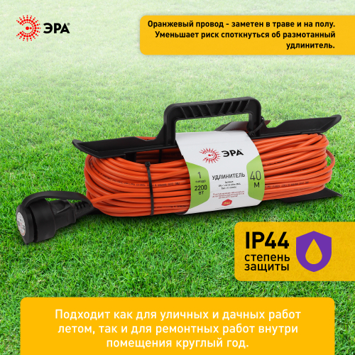 Удлинитель силовой на рамке UFx-1-2x1.0-40m без заземления, ПВС 2х1м2, 1 розетка с защитной крышкой, 40м, степень защиты IP44. Мощность 10А/2200Вт. Используется для работы на строительных площадках или дачных участках. Удобен при работе с приборами находящимися удаленно от стационарной розетки. Например, газонокосилки, электрические, пилы, триммеры или электродрели. Провод в удлинителях Эра сделан из 100% меди, что делает его абсолютно пожаробезопасным. Рама-полипропилен.