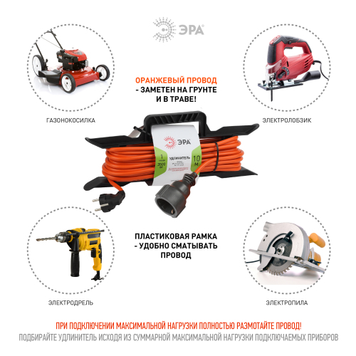 Удлинитель силовой на рамке UFx-1e-3x1.5-10m с заземлением, ПВС 3x1,5м2, 1 розетка, 10м, степень защиты IP20. Мощность 16А/3500Вт. Используется для работы на строительных площадках или дачных участках. Удобен при работе с приборами находящимися удаленно от стационарной розетки. Например, газонокосилки, электрические, пилы, триммеры или электродрели. Провод в удлинителях Эра сделан из 100% меди, что делает его абсолютно пожаробезопасным. Рама-полипропилен.