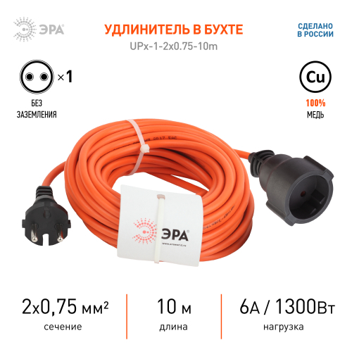 Силовой удлинитель ЭРА UPx-1-2x0.75-10m с крышкой, защищённый от пыли и влаги - IP 44. Длина шнура 10 метров. Позволяет работать с электроприборами на значительном расстоянии от сети. Максимальная нагрузка - 6 А / 1300 Вт. Надёжный двухжильный провод по ГОСТу, гнездо имеет защитную каучуковую крышку. Можно эффективно использовать при температурах от -25 до +40 °С. Отличное решение для строительных, ремонтных, дачных работ. Удобен при работе с приборами, находящимися удаленно от стационарной розетки. Например, газонокосилки, электрические, пилы, триммеры или электродрели. Провод в удлинителях Эра сделан из 100% меди, что делает его абсолютно пожаробезопасным.