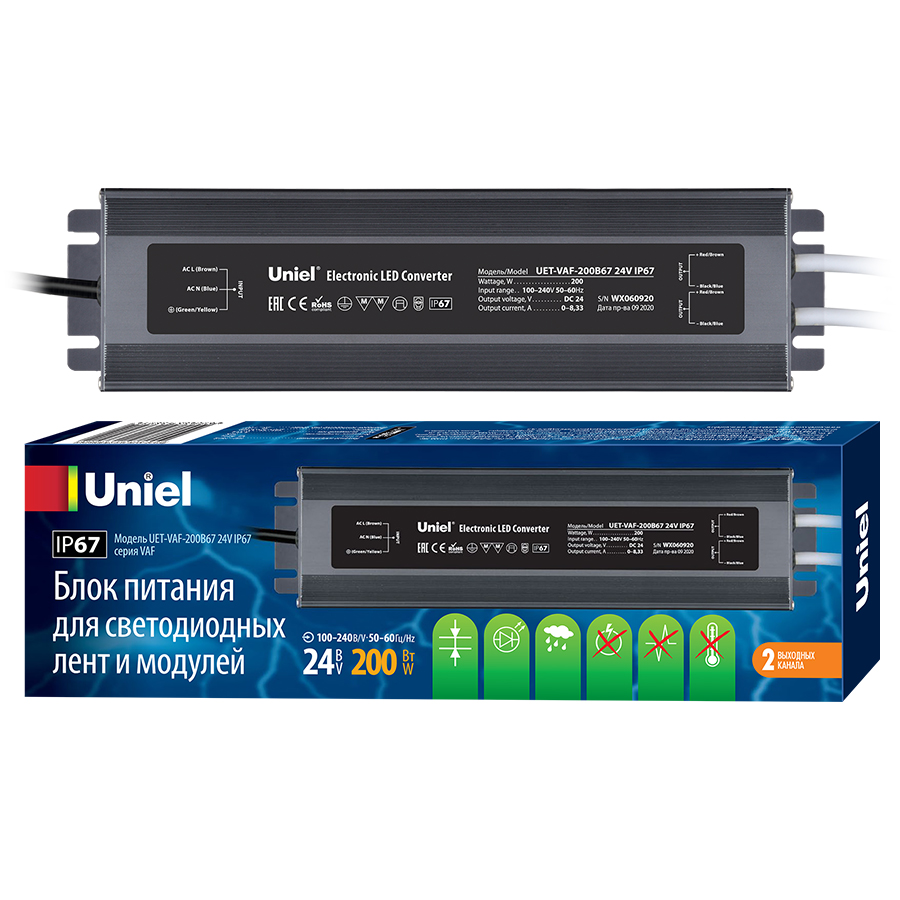 Блок питания ультратонкий UET-VAF-200B67 24V IP67 предназначен для светодиодных источников света постоянного напряжения, а именно светодиодных лент и модулей. Количество выходов - 2. Ультратонкий герметичный корпус выполнен из алюминия, цвет - серебристый. Входное напряжение - 100-240 В. Высокая степень защиты: от короткого замыкания, скачков напряжения, от перегрева и перегрузки. Мощность - 200 Вт, степень пылевлагозащиты - IP67. Диапазон рабочих температур - от -25 до +50 С˚. Габариты блока питания - ДхШхВ 250х72х32 мм. Общий вес комплекта - 1085 г. Гарантия от производителя - 2 года. Срок службы - 30 000 часов.