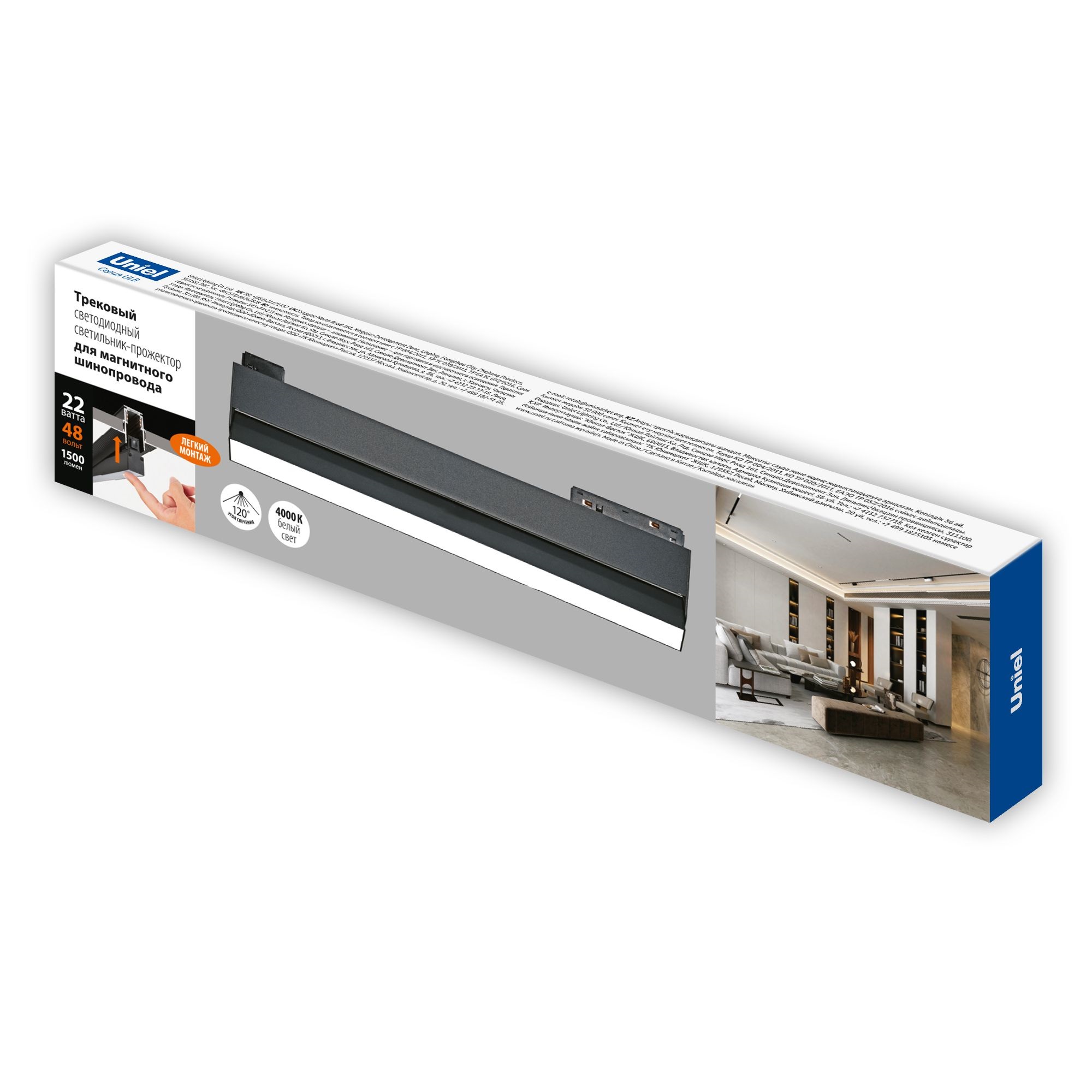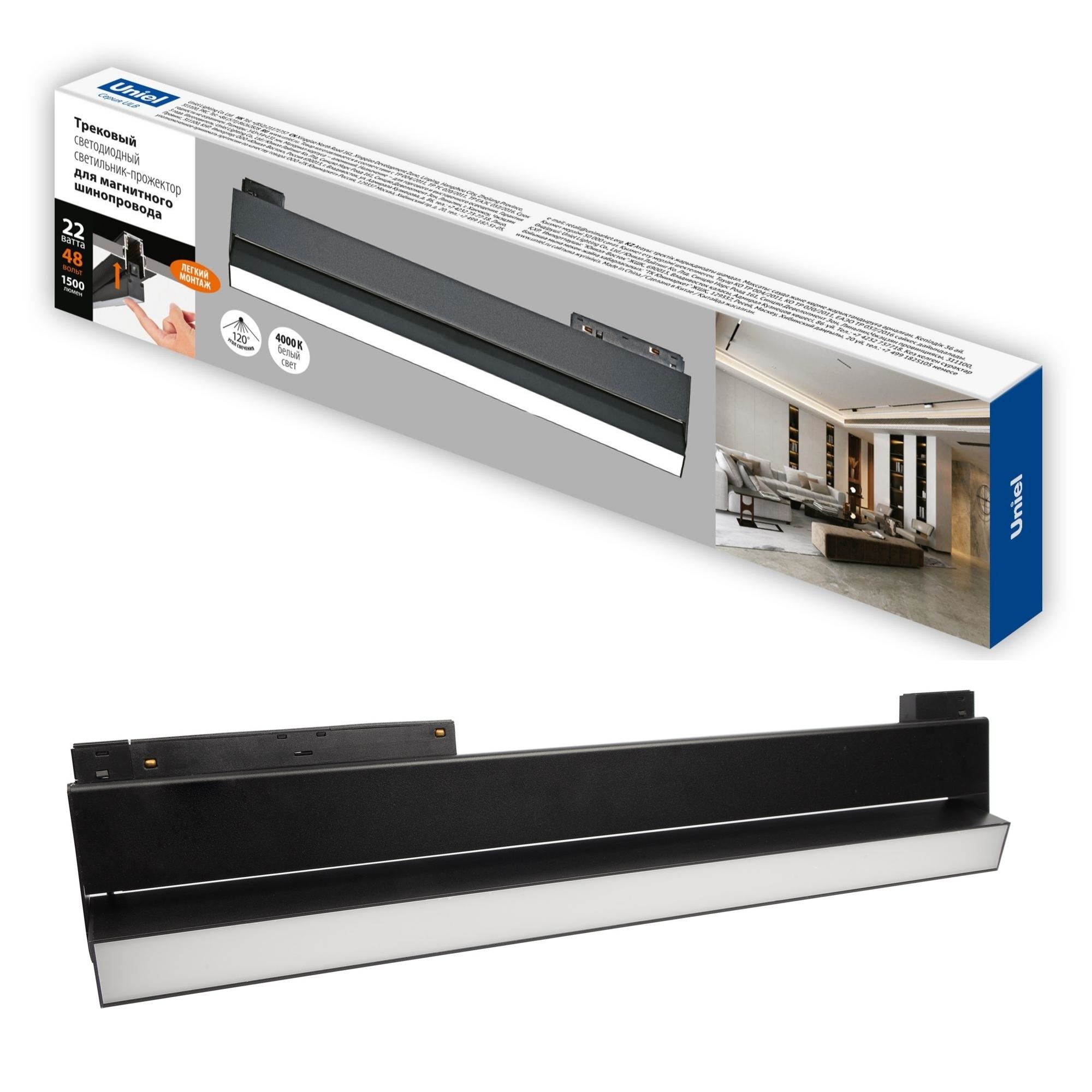 Светильник-прожектор линейный светодиодный трековый ULB-M80-22W/4000K/35 BLACK предназначен для освещения коммерческих и бытовых помещений, таких как торговые центры, выставочные павильоны, рестораны, отели. Прожектор монтируется на магнитные токопроводящие шины (треки) и фиксируется с помощью мощных магнитов. Специальная конструкция проводников шинопровода исключает возможность неправильного подключения светильников. Трековые светильники незаменимы для акцентного освещения и оригинальных световых решений. Мощность светильника составляет 22 Вт, световой поток 2000 лм. Цвет свечения - белый. Цветовая температура 4000К. Корпус прибора изготовлен из алюминия, окрашенного в черный цвет. Способ установки - трековый. Степень пылевлагозащиты светильника IP20. Диапазон рабочих температур прожектора от -20 до +40 °С. Требуется подключение к электросети. Габариты устройства - ДхШхВ 550х35х125 мм. Вес изделия - 1040 г. Гарантия - 3 года. Срок службы светильника - 50 000 часов.