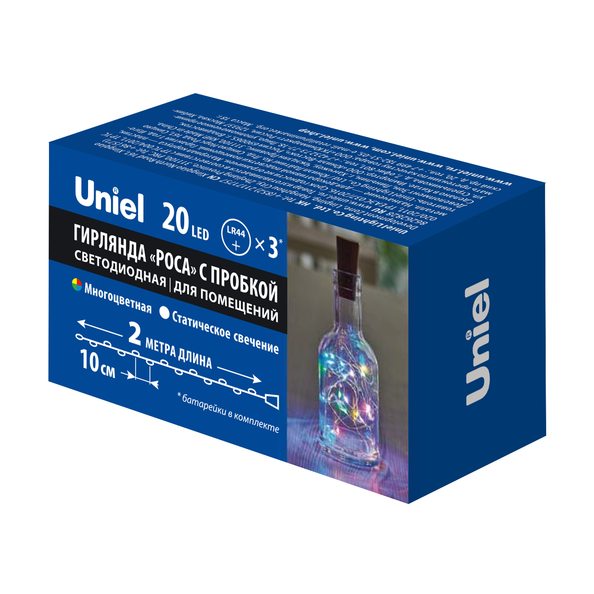 Гирлянда светодиодная Роса с пробкой на батарейках ULD-S0200-020/SСR/3LR MULTI IP20 WINESTOPPER предназначена для декоративной подсветки и праздничного оформления в помещении. Свет - разноцветный (синий, красный, желтый, зеленый). Гирлянда изготовлена из пластика и металла (медный провод). Питание изделия производится от 3 батареек типа LR44 (входят в комплект). Тип свечения - статический. Температурный режим работы от -20 до +35 С˚, степень пылевлагозащиты IP 20. Длина гирлянды составляет 2 м, общее количество светодиодов - 20 шт. В комплекте кабель длиной 0,3 м. Светодиодная гирлянда с пробкой на батарейках - оригинальный аксессуар для украшения праздничного стола и декора. Не требует подключения к сети. Поставляется в картонной упаковке. Габариты гирлянды - ДхШхВ 2000х25х50 мм. Вес изделия - 15 г. Гарантия от производителя - 1 год. Срок службы - 30000 часов.