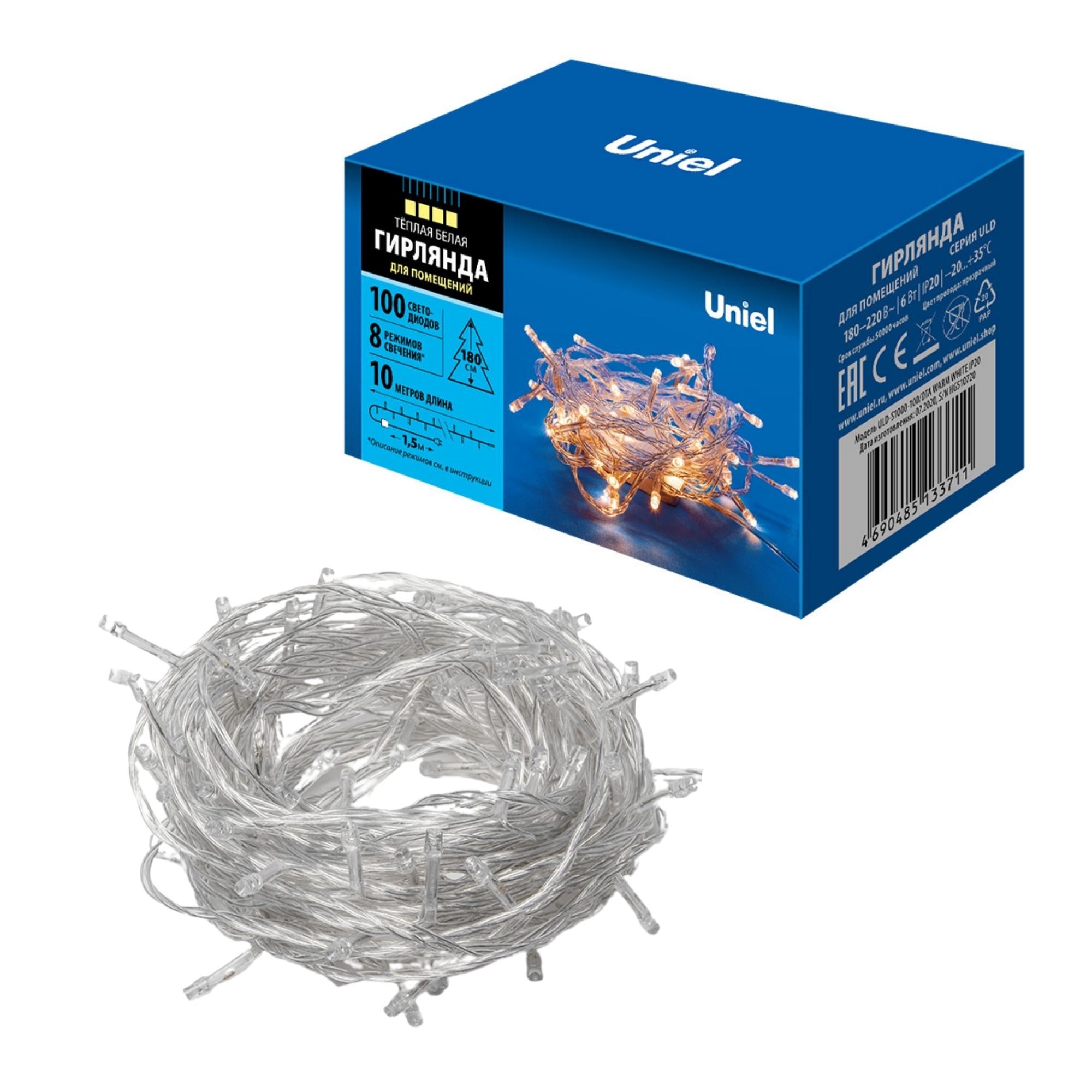 Гирлянда светодиодная ULD-S1000-100/DTA WARM WHITE IP20 предназначена для декоративной подсветки и праздничного оформления в помещении. Свет - теплый белый. Гирлянда имеет 8 режимов свечения - волнообразный, последовательный, перетекающий, бегущая вспышка, затухающий, мерцающий, постоянный и комбинированный (воспроизводит все режимы по очереди). Переключение режимов свечения осуществляется с помощью контроллера (в комплекте). Гирлянда изготовлена из пластика, цвет провода - прозрачный. Материал изоляции кабеля - ПВХ. Температурный режим работы от -20 до +35 С˚, степень пылевлагозащиты IP 20. Длина гирлянды составляет 10 м, общее количество светодиодов - 100 шт. Мощность - 6 Вт. Цветовая температура - 3000 К. В комплектацию входит сетевой кабель длиной 1,5 м. Светодиодная гирлянда - это простой и оригинальный способ создать праздничную атмосферу дома, на даче и в офисе. Гирлянда - яркий элемент праздничного декора в интерьере и украшение для елки 180 см. Требуется подключение к сети. Поставляется в картонной упаковке. Габариты гирлянды - ДхШхВ 10000х30х25 мм. Вес изделия - 106 г. Гарантия от производителя - 1 год. Срок службы - 50000 часов.