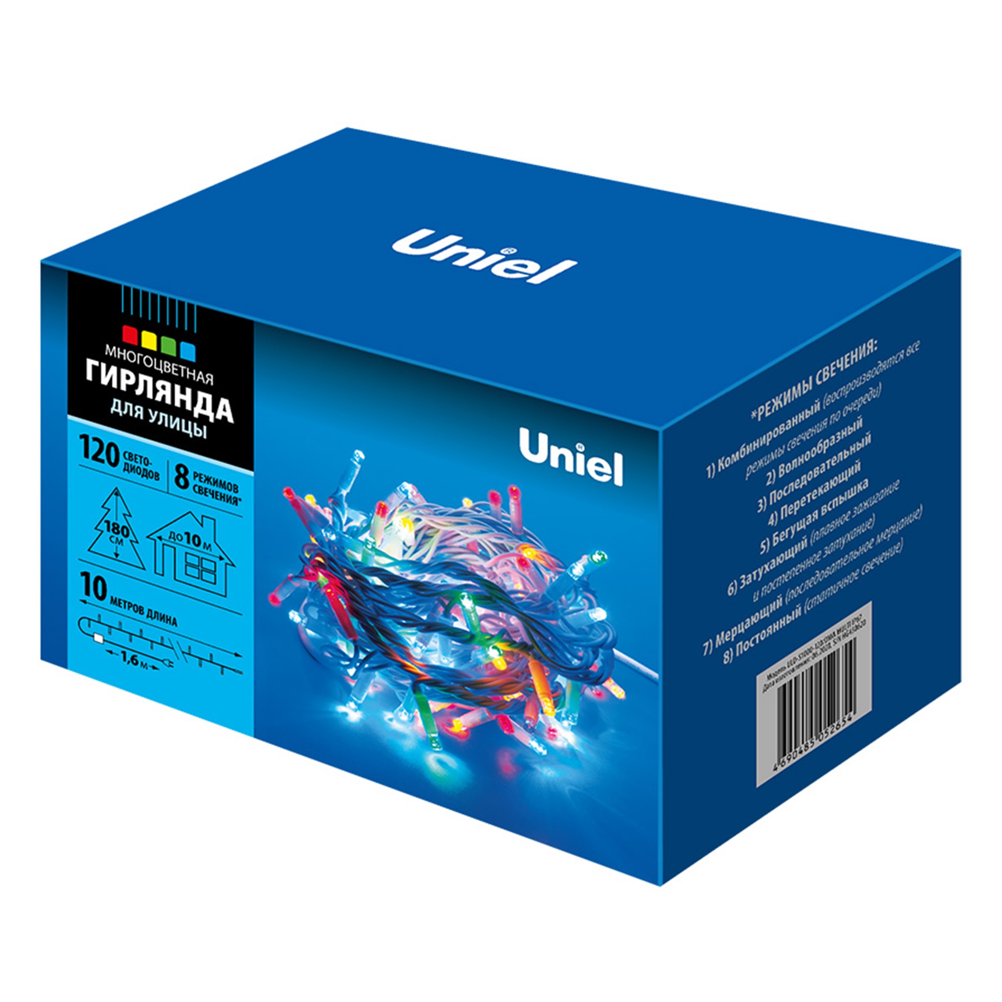 Гирлянда светодиодная ULD-S1000-120/DWA MULTI IP67 с контроллером предназначена для декоративной подсветки и праздничного оформления в помещении, а также наружного дизайна. Свет - разноцветный (синий, красный, желтый, зеленый). Гирлянда имеет 8 режимов свечения - волнообразный, последовательный, перетекающий, бегущая вспышка, затухающий, мерцающий, постоянный и комбинированный (воспроизводит все режимы по очереди). Переключение режимов свечения осуществляется с помощью контроллера (в комплекте). Гирлянда изготовлена из пластика, цвет провода - белый. Материал изоляции кабеля - каучук. Температурный режим работы от -30 до +35 С˚, степень пылевлагозащиты IP 67. Длина гирлянды составляет 10 м, общее количество светодиодов - 120 шт. Мощность 5 Вт. В комплекте сетевой кабель длиной 1,5 м. Декоративная светодиодная гирлянда - яркий элемент праздничного декора дома, на даче и на улице, а также украшение для елки 180 см. Требуется подключение к сети. Поставляется в картонной упаковке. Габариты гирлянды - ДхШхВ 10000х40х30 мм. Вес изделия - 890 г. Гарантия от производителя - 1 год. Срок службы - 50000 часов.