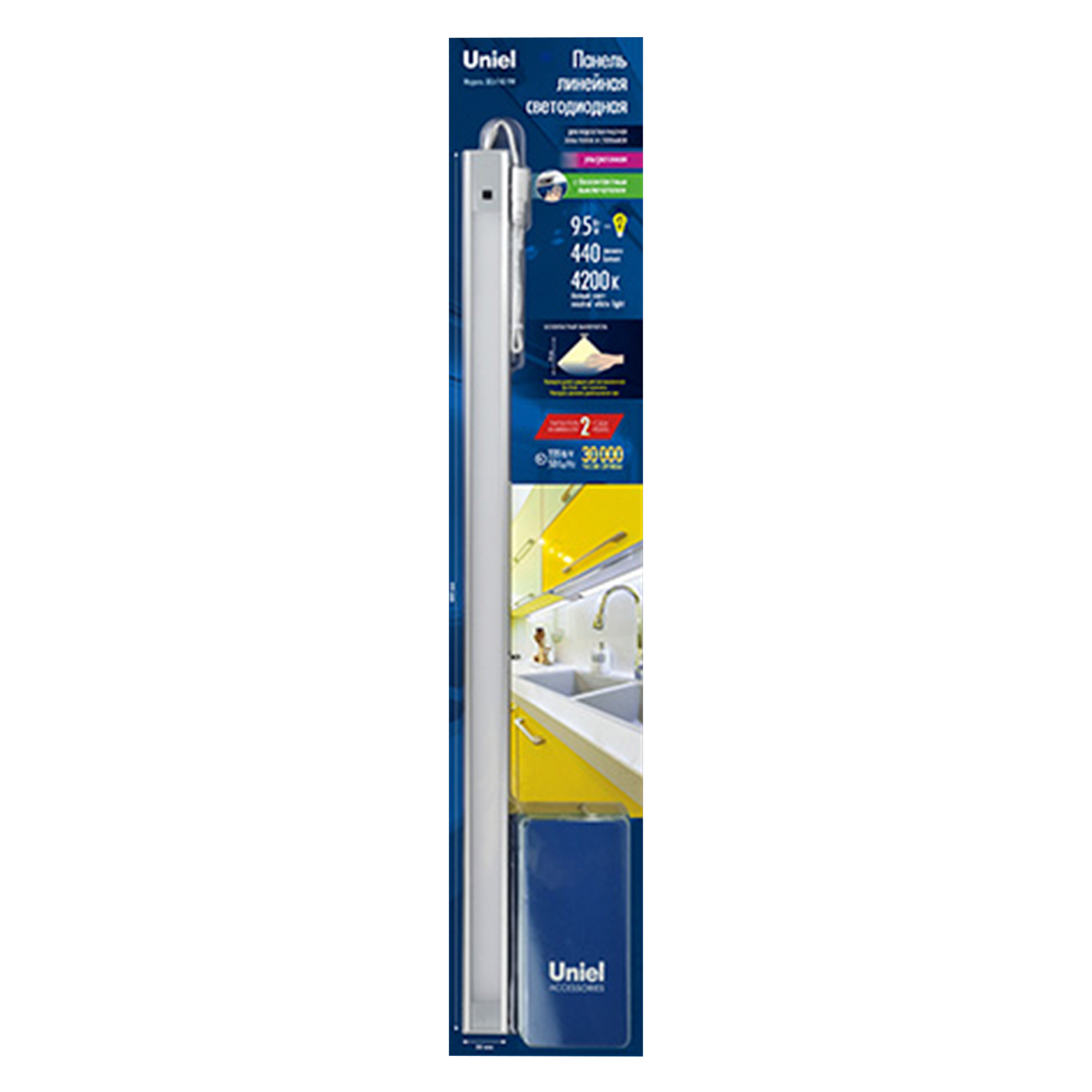 Светильник линейный светодиодный ультратонкий ULI-F40-9W-4200K SENSOR IP20 SILVER предназначен для подсветки рабочей зоны на кухне, шкафов, полок, стеллажей. Мощность светильника составляет 9 Вт, световой поток 440 лм, цветовая температура 4200К. Светильник оснащен бесконтактным выключателем, который расположен на корпусе. Для включения необходимо провести рукой в зоне действия сенсорного выключателя, для выключения повторить манипуляцию. Прибор изготовлен из металла, цвет корпуса - серебристый. Цвет свечения - белый. Лаконичный дизайн светильника впишется в любой интерьер. Степень пылевлагозащиты светильника IP20. Длина кабеля питания - 1,83 метра. Способ монтажа - накладной, настенный. Крепежные изделия входят в комплект поставки. Габариты изделия - ДхШхВ 600х30х8 мм. Общий вес комплекта 467 г. Гарантия - 1 год. Срок службы светильника - 30 000 часов.