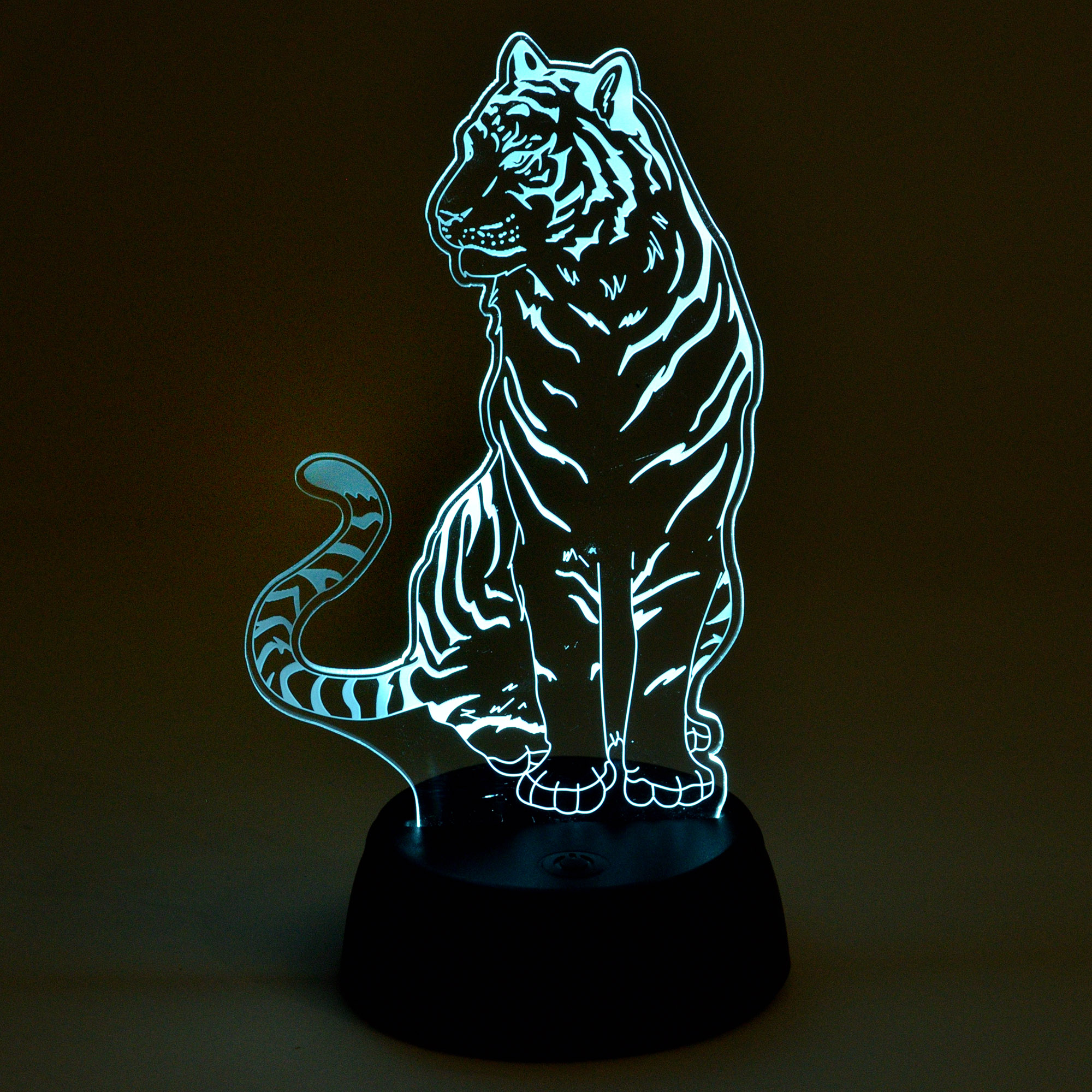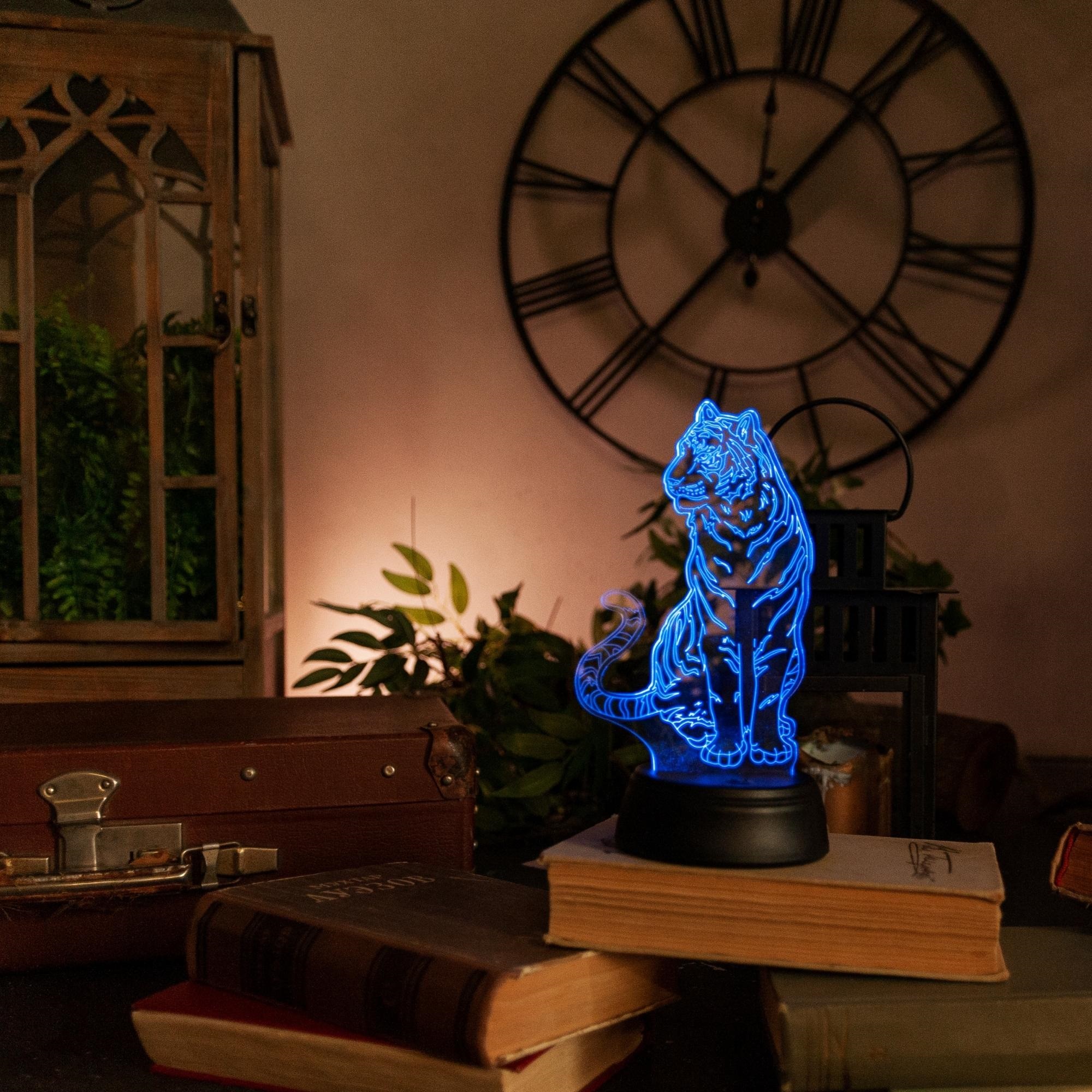 Светильник декоративный с эффектом 3D Тигр на батарейках ULI-M507 RGB/3AA TIGER/BLACK предназначен для украшения интерьера. Благодаря высокотехнологичному дизайну, светильник создает иллюзию объемного изображения. Удобная кнопка управления расположена на основании светильника. Питание производится от 3 батереек АА (в комплект не входят) или с помощью USB (стандартный USB-провод входит в комплект). Длина кабеля - 1 м. Свечение - RGB (разноцветное). Тип свечения - статическое одним цветом или смена цветов. Светильник изготовлен из пластика, цвет корпуса - черный и прозрачный. Общее количество светодиодов - 5 шт. Мощность - 0,5 Вт. Степень пылевлагозащиты - IP20, диапазон рабочих температур от -5 до +35 °С. Декоративные светильники с 3D эффектом - оригинальное и стильное решение для украшения интерьера и праздничного декора. Поставляется в картонной упаковке. Габариты светильника - ДхШхВ 105х98х205 мм. Вес изделия - 152 г. Гарантия от производителя - 1 год. Срок службы - 30 000 часов.