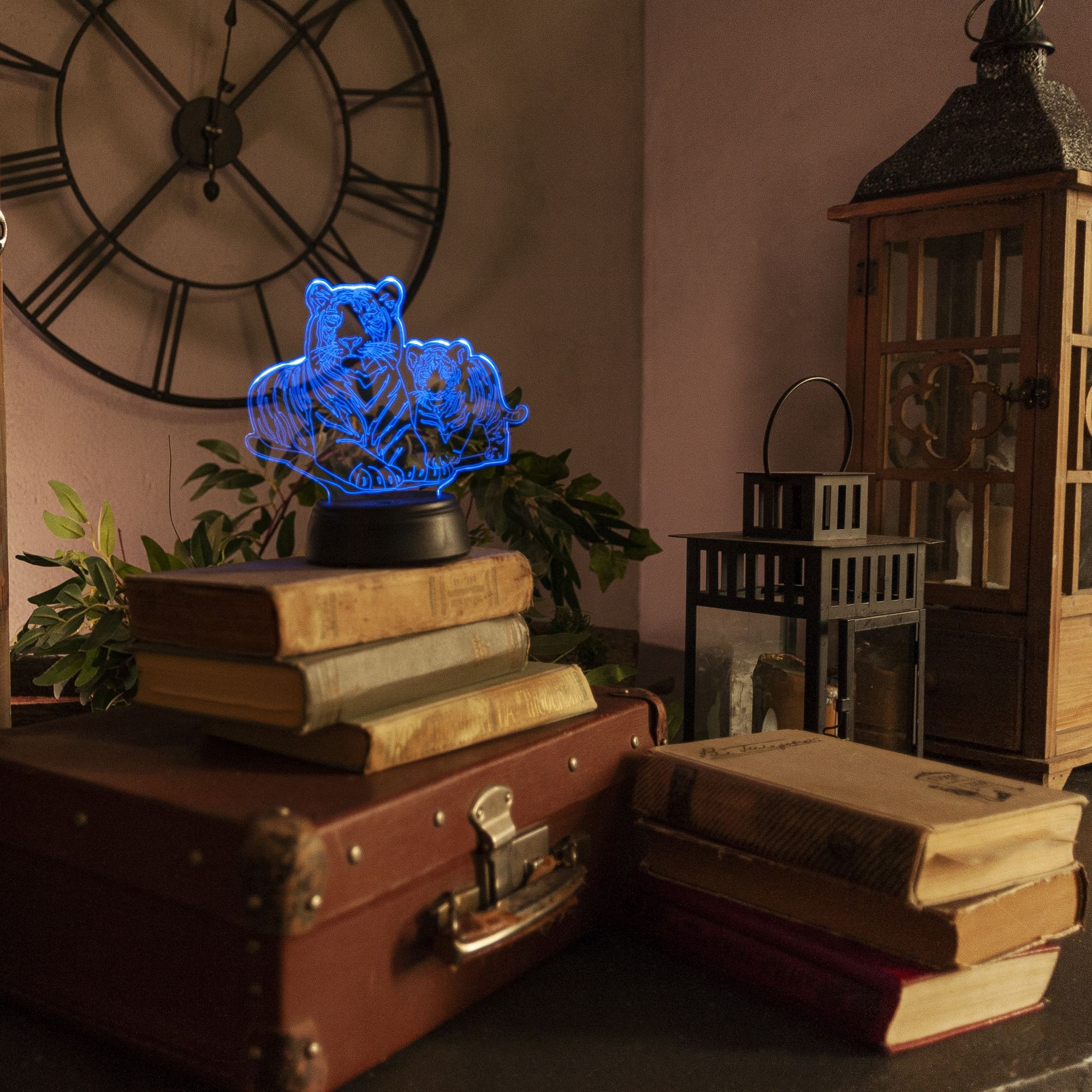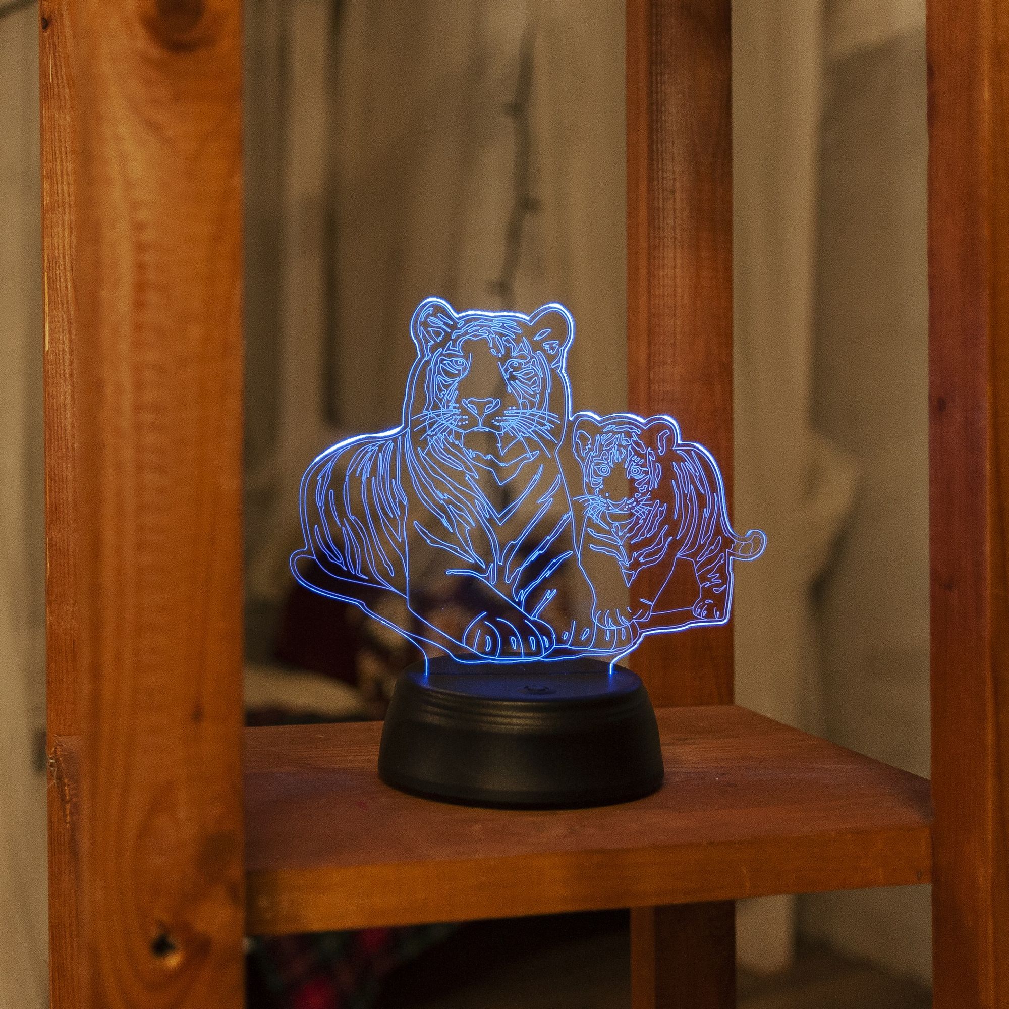 Светильник декоративный с эффектом 3D Семья тигров на батарейках ULI-M508 RGB/3AA TIGER FAMILY/BLACK предназначен для украшения интерьера. Благодаря высокотехнологичному дизайну, светильник создает иллюзию объемного изображения. Удобная кнопка управления расположена на основании светильника. Питание производится от 3 батереек АА (в комплект не входят) или с помощью USB (стандартный USB-провод входит в комплект). Длина кабеля - 1 м. Свечение - RGB (разноцветное). Тип свечения - статическое одним цветом или смена цветов. Светильник изготовлен из пластика, цвет корпуса - черный и прозрачный. Общее количество светодиодов - 5 шт. Мощность - 0,5 Вт. Степень пылевлагозащиты - IP20, диапазон рабочих температур от -5 до +35 °С. Декоративные светильники с 3D эффектом - оригинальное и стильное решение для украшения интерьера и праздничного декора. Поставляется в картонной упаковке. Габариты светильника - ДхШхВ 170х98х160 мм. Вес изделия - 164 г. Гарантия от производителя - 1 год. Срок службы - 30 000 часов.