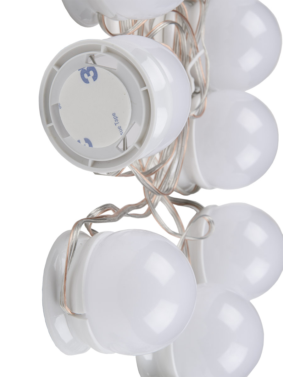 Светодиодный светильник предназначен для подсветки в условиях темноты или недостаточного освещения в режиме съемки фото и видео, для нанесения макияжа. Светильник имеет функцию регулировки яркости и цветовой температуры (теплый свет 3000К, белый свет 4000К, дневной свет 6500К). Для простоты установки на лампочках имеется двухсторонняя клейкая лента с помощью, которой лампочки можно установить на монтажную поверхность. Длина провода между лампами регулируется от 15 до 33 см. Лишний провод необходимо намотать на основание лампы. Лампочки лучше размещать равномерно по сторонам зеркал это позволит создать равномерную подсветку по периметру зеркала. Подключение светильника к сети происходит через переходник USB 5В 2А (в комплекте). Размер лампы 45*45*51 мм. Мощность светильника 8 Вт, мощность одной лампы 0,8 Вт. Степень защиты IP20.